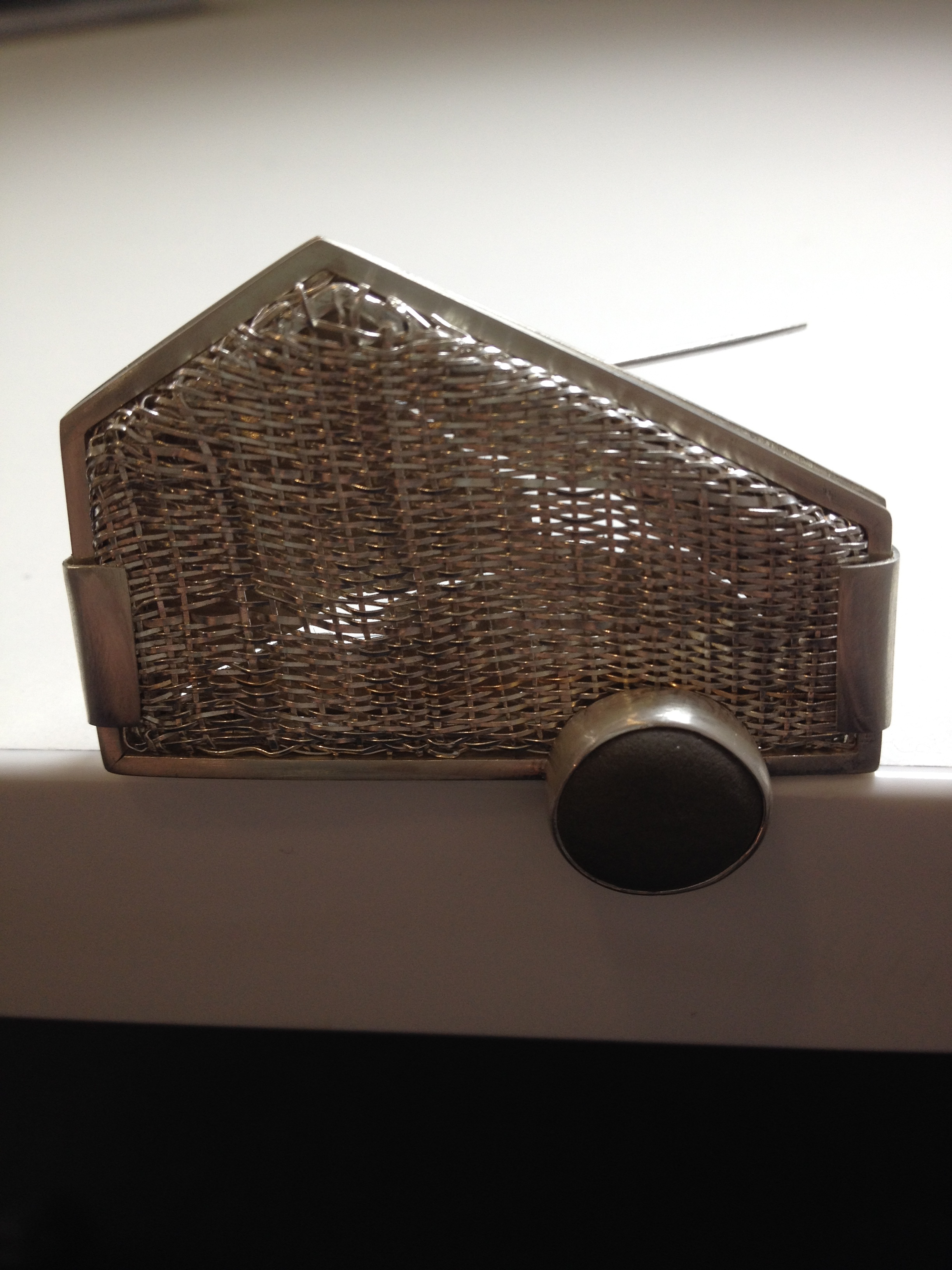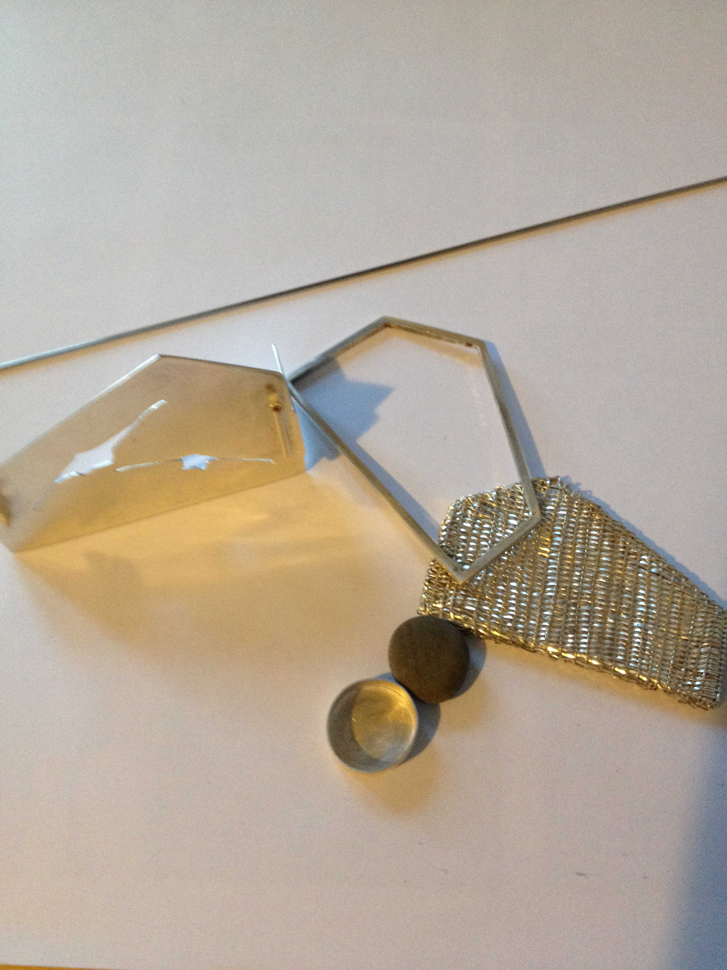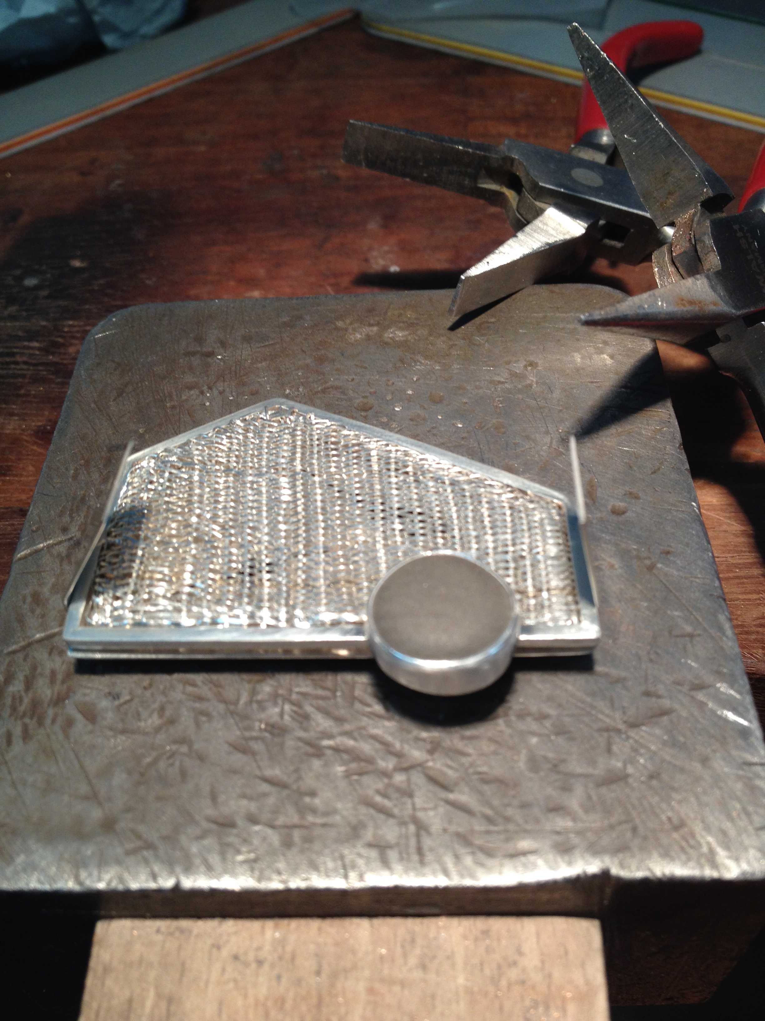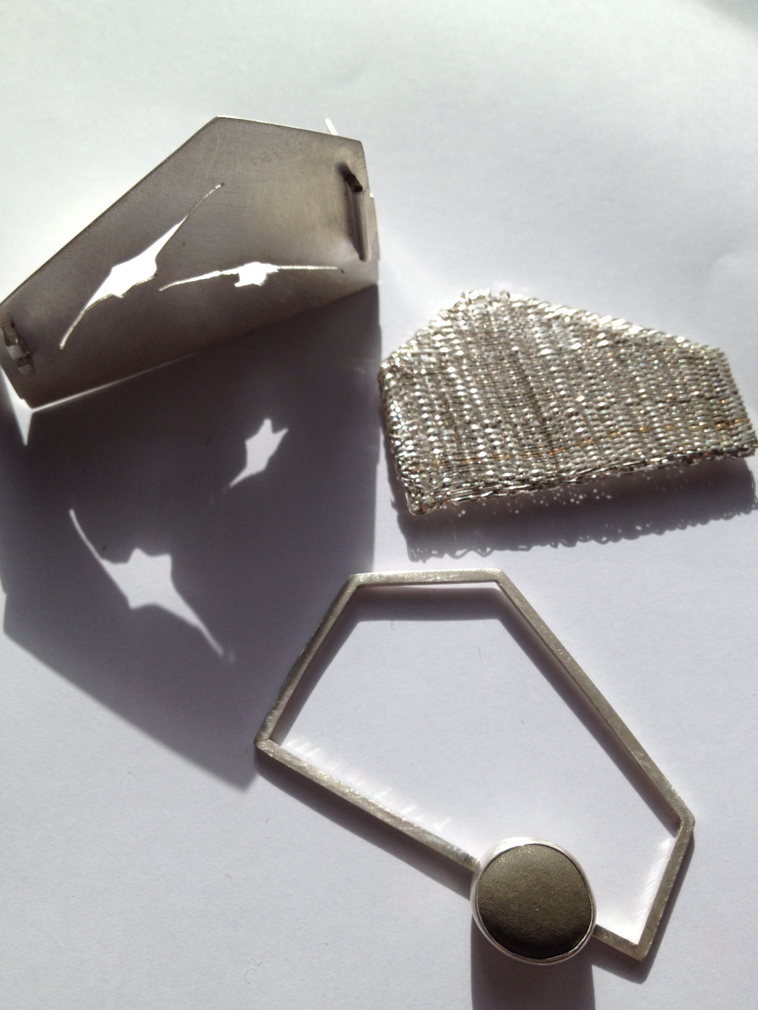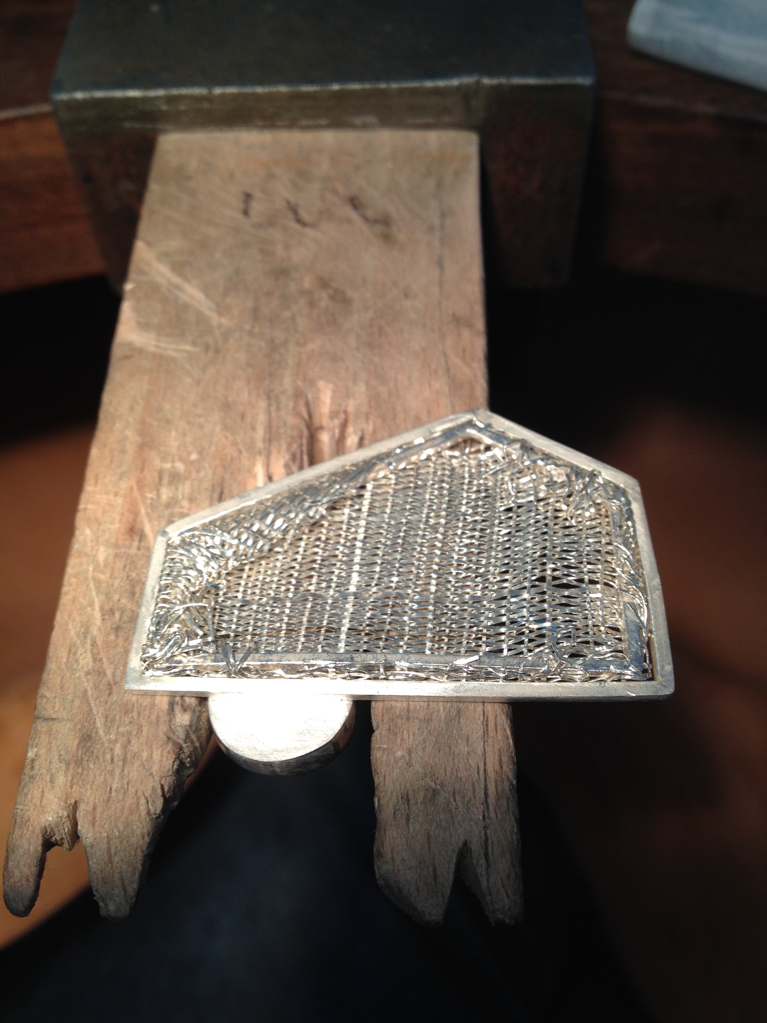 weave silver/gold version of fine metal ‘fabric’ to incorporate into finished piece – copper version shown abovemake silver findings for broochthis strikethrough is a bit of a cheat as I’d already made these ;))trap silver weave in double ‘house’ frame (as above)- cut out and pierce backplate